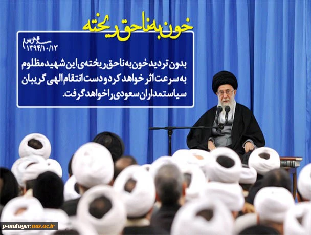 امتیاز دهید : رهبر معظم انقلاب: «بدون تردید خون به ناحق ریختهی این شهید مظلوم به سرعت اثر خواهد کرد و دست انتقام الهی گریبان سیاستمداران سعودی را خواهد گرفت.» 2 دوشنبه 14 دی 1394 ساعت 11:43